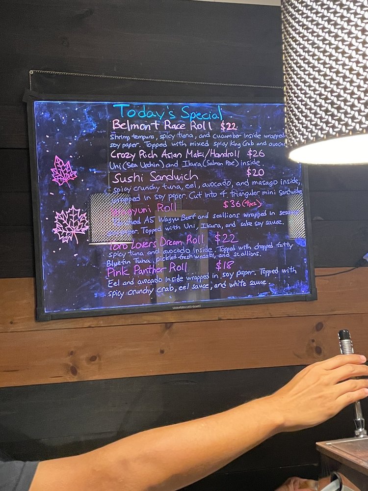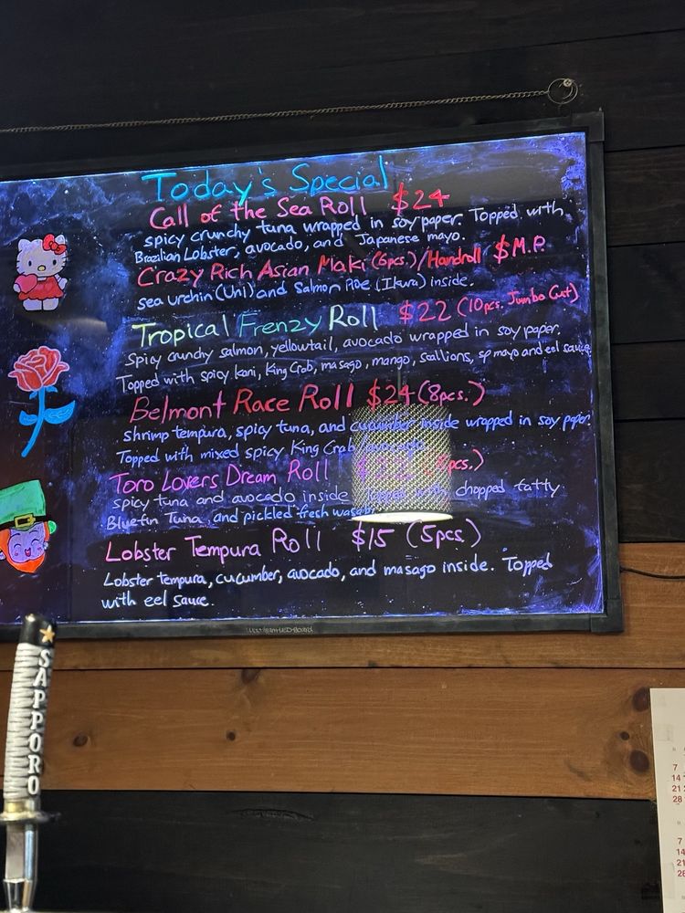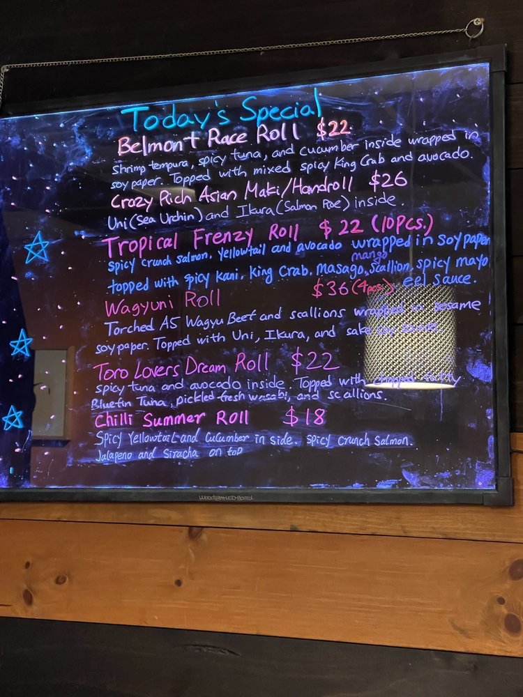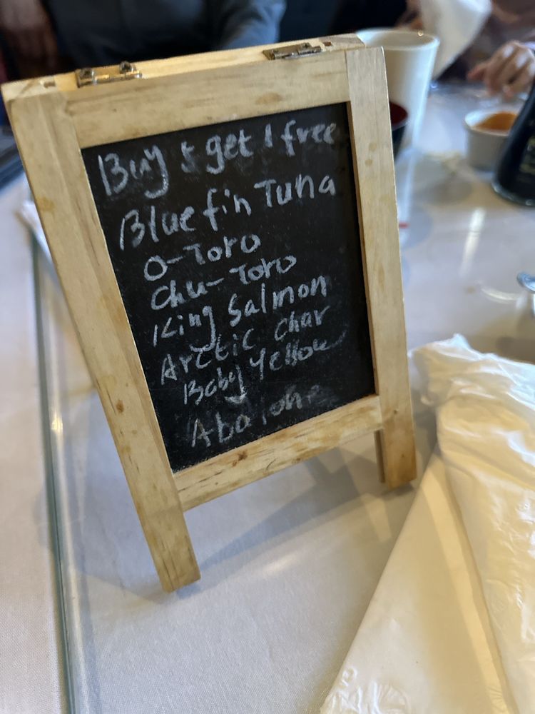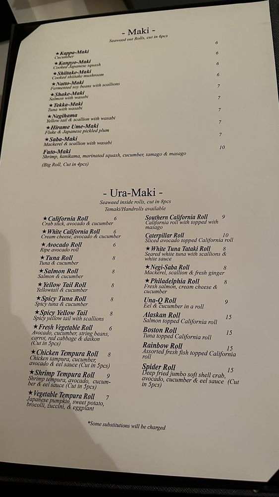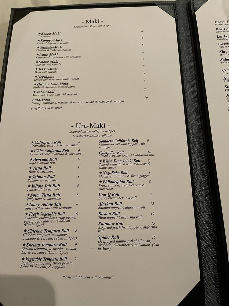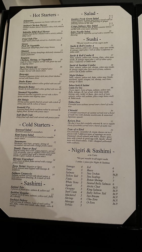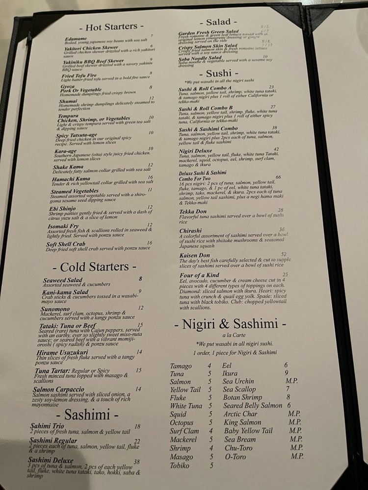 Tuna, salmon, yellow tail, fluke, white tuna tataki, mackerel, squid, octopus, eel, shrimp, surf clam, tamago, and ikura.